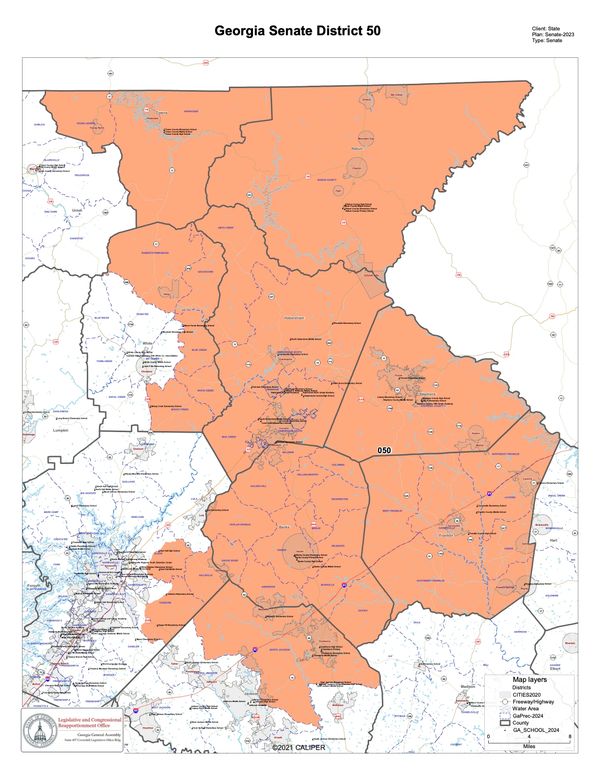 Georgia's State Senate District 50 is made up of all of Banks, Franklin, Habersham, Rabun, Stephens, and Towns counties and parts of Hall, Jackson, and White counties.